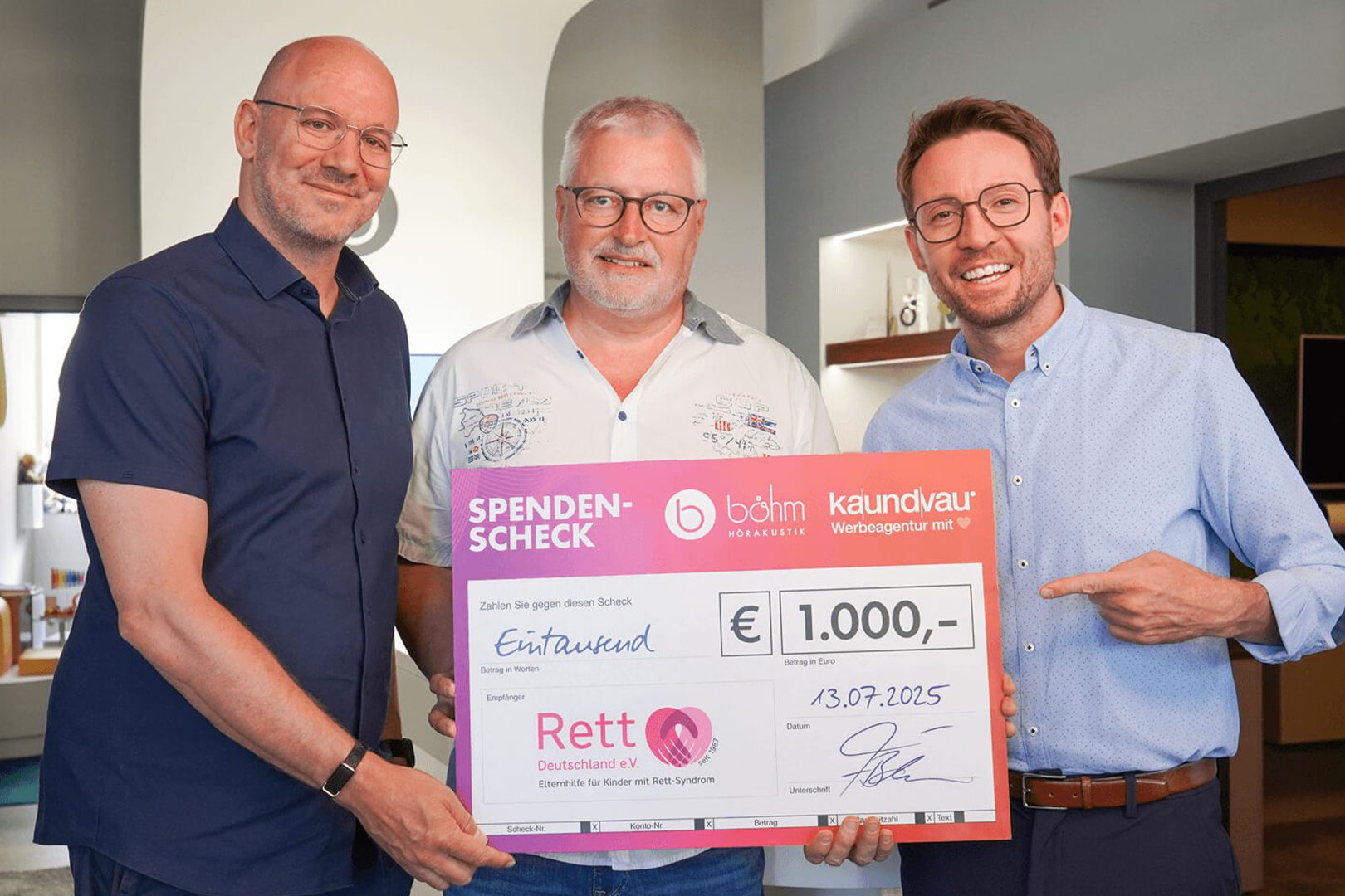 Um diese wertvolle Arbeit zu unterstützen, haben BÖHM Hörakustik und wir von kaundvau gemeinsam eine Spende in Höhe von 1.000 Euro an den Verein übergeben. Fabian Böhm, dessen Tochter selbst vom Rett-Syndrom betroffen ist, überreichte zusammen mit unserem Geschäftsführer Tom Kellersohn den symbolischen Spendenscheck an Uwe Schmidt, den Schatzmeister der Regionalgruppe Baden Württemberg des Rett Deutschland e.V.